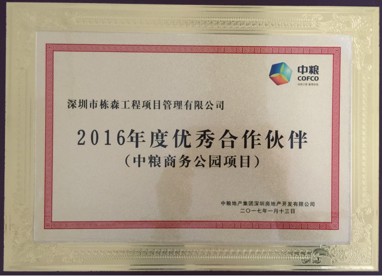 中糧地產(chǎn)集團(tuán)深圳房地產(chǎn)開(kāi)發(fā)有限公司2016年度優(yōu)秀合作伙伴