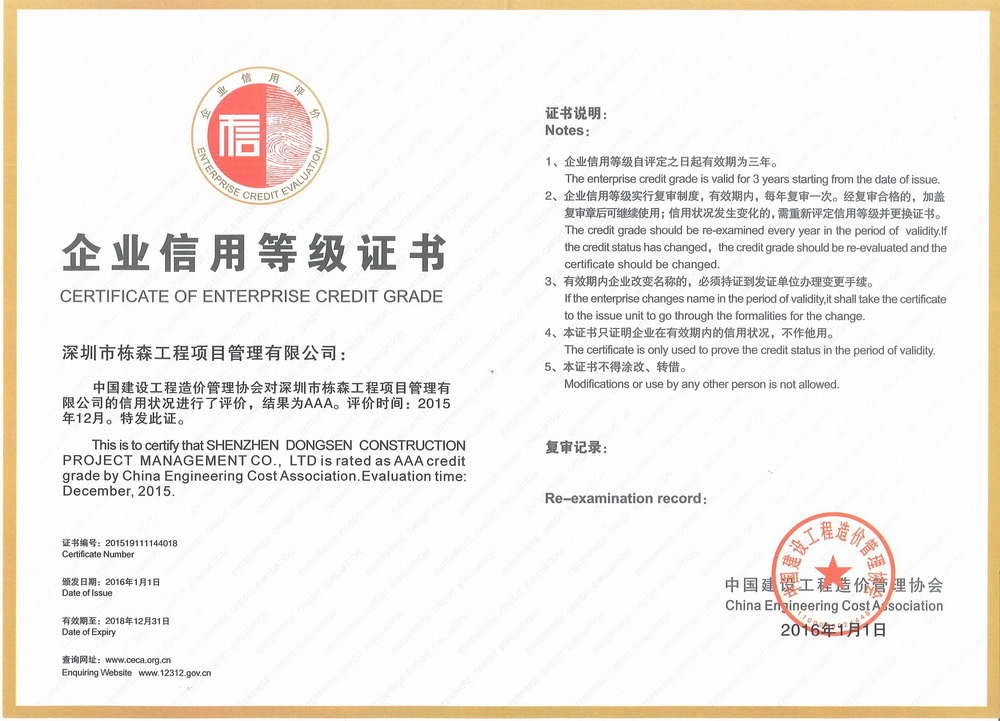 中國(guó)建設(shè)工程造價(jià)管理協(xié)會(huì)企業(yè)信用等級(jí)AAA