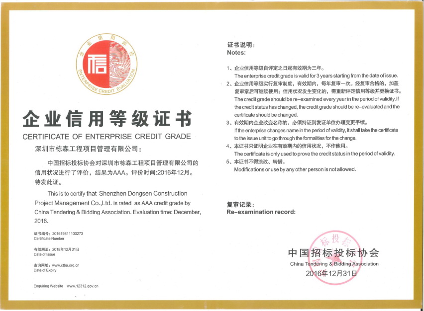 中國(guó)招標(biāo)投標(biāo)協(xié)會(huì)企業(yè)信用等級(jí)AAA