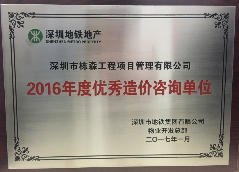 深圳市地鐵集團(tuán)有限公司物業(yè)開(kāi)發(fā)總部2016年度優(yōu)秀造價(jià)咨詢(xún)單位