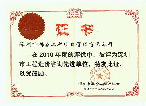 榮獲造價(jià)咨詢先進(jìn)單位稱號(hào)(2010年度) |