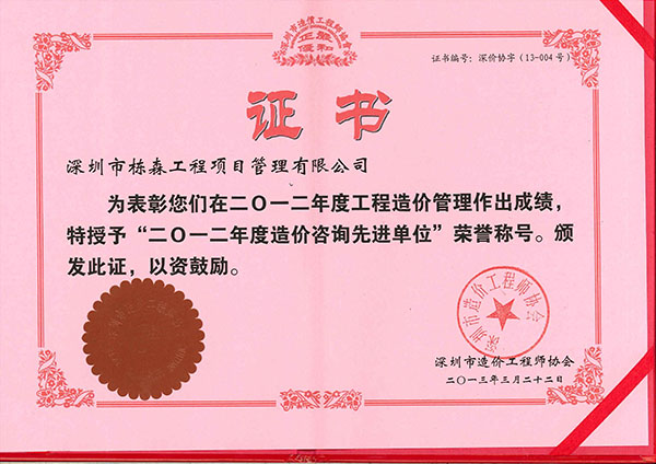 | 榮獲造價(jià)咨詢先進(jìn)單位稱號(hào)(2012年度) |