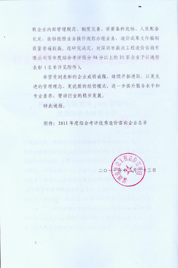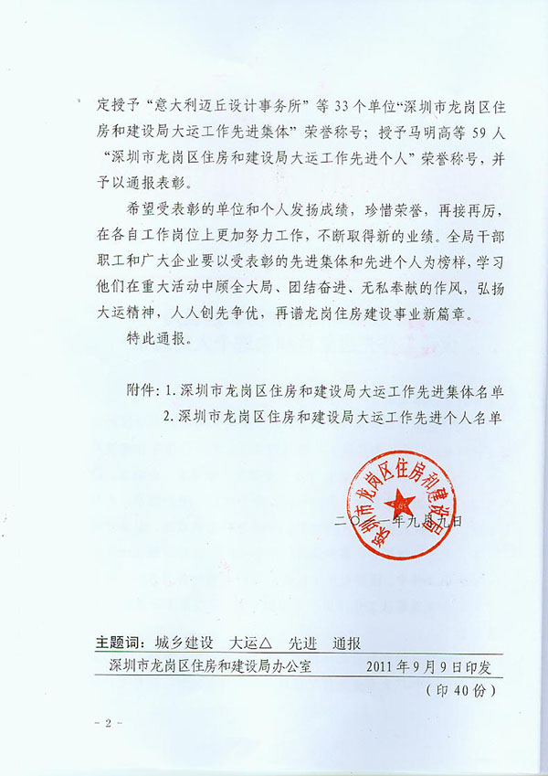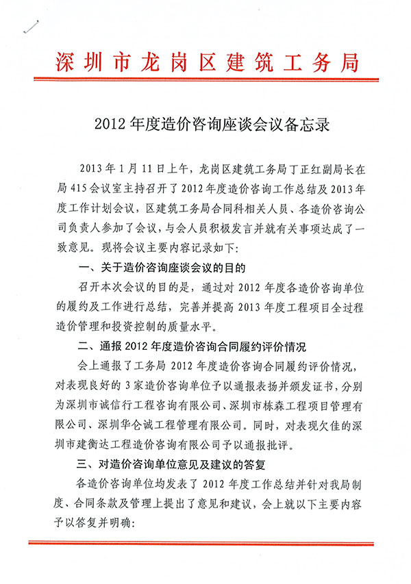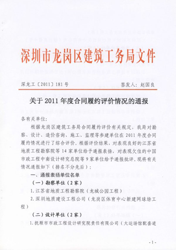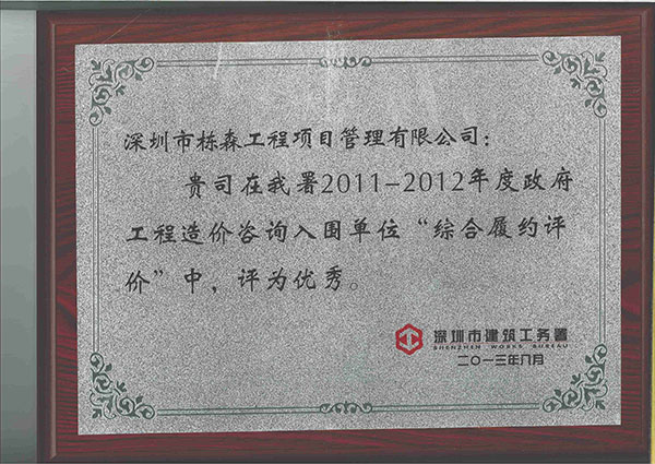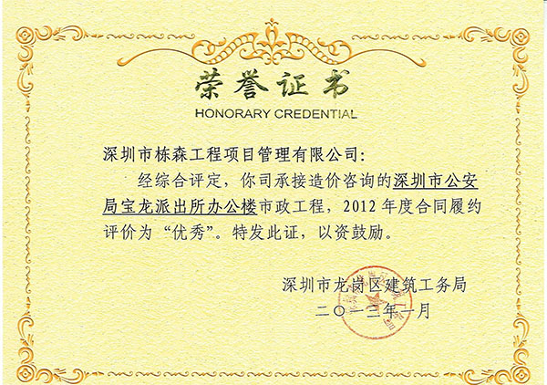 | 榮獲龍崗區(qū)建筑工務(wù)局2012年度履約優(yōu)秀單位 |