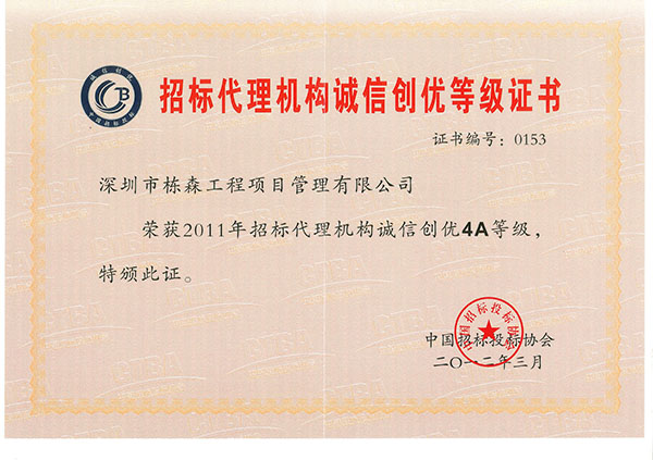 榮獲2011年招標(biāo)代理機(jī)構(gòu)誠(chéng)信創(chuàng)優(yōu)4A等級(jí)單位 |