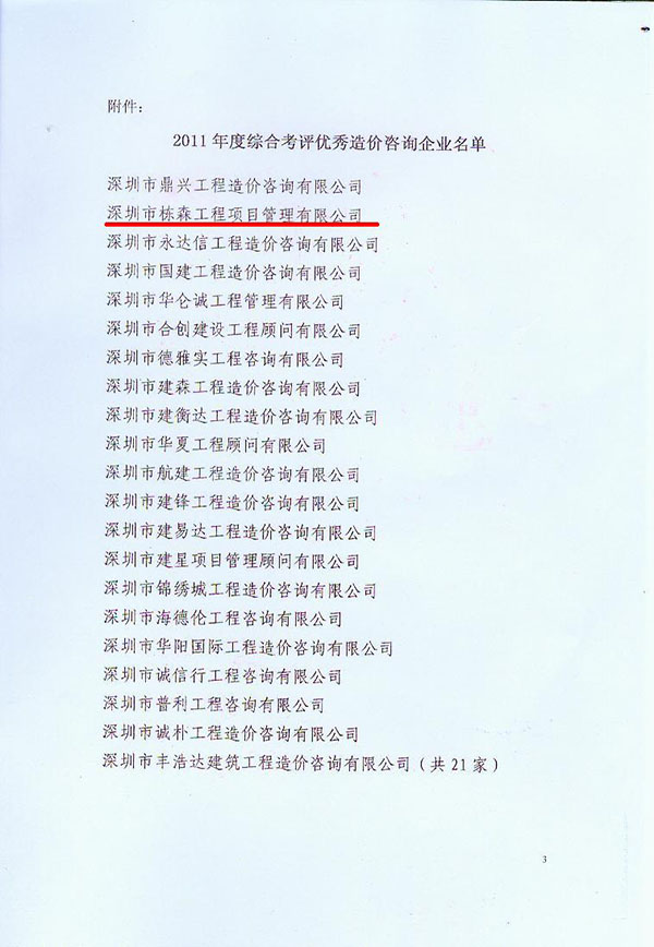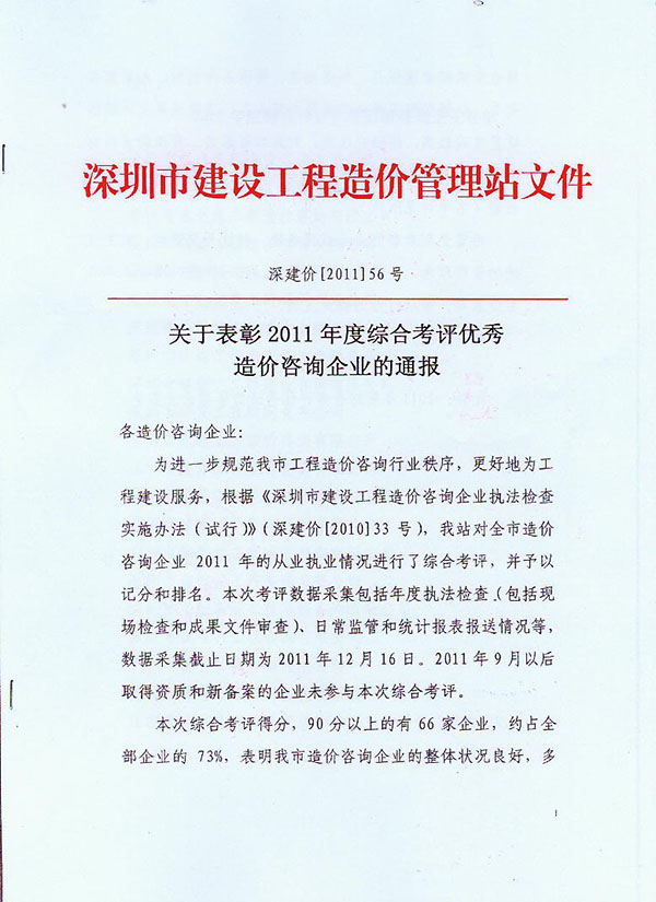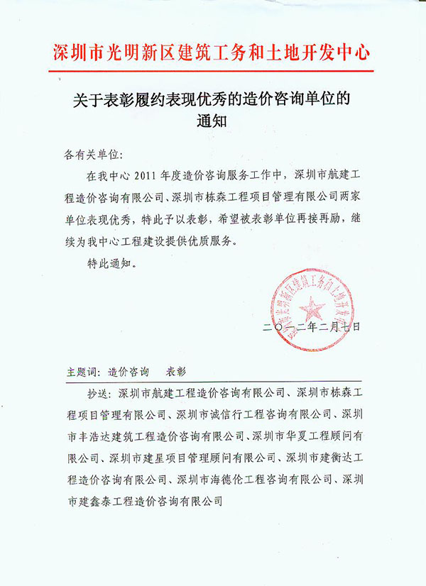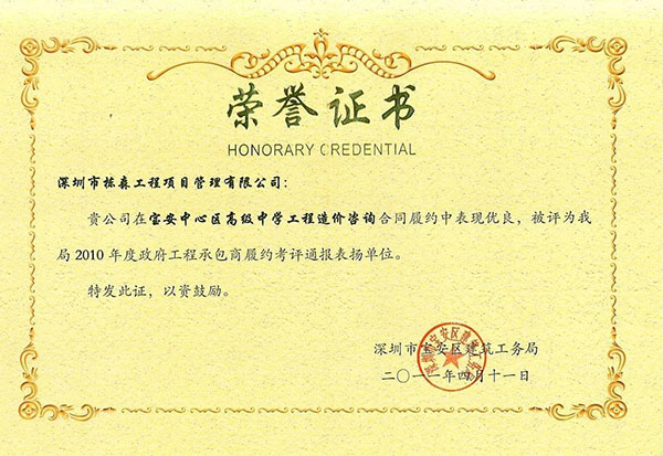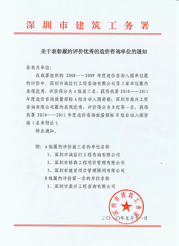 寶安區(qū)建筑工務(wù)局2010年度預(yù)選承包商履約考評(píng)優(yōu)秀 |