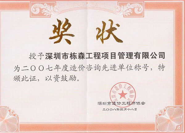 | 榮獲造價(jià)咨詢先進(jìn)單位稱號(hào)(2007年度) |